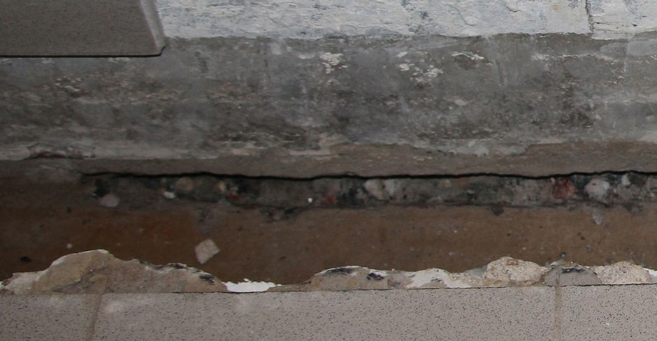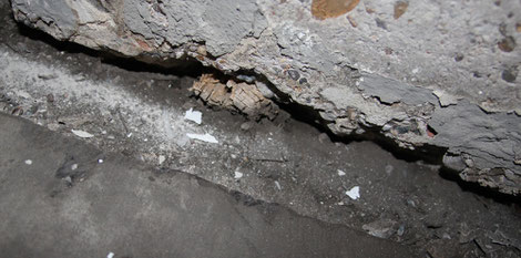 Fuge in einer Tiefgarage geöffnet worden. Man sieht deutlich, dass Feuchtigkeit nach innen gezogen ist. Zudem wurde bei der Errichtung des Gebäudes geschlampt. Im Fugenbereich wurden Holzstücke