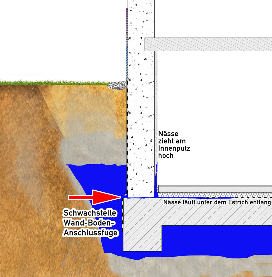 die Jahre stark beanspruchen. Wenn nun von außen Druckwasser oder aufstauendes Sickerwasser ansteht, kann sich dieses Wasser durch die Fuge drücken. Da der Innenputz (zumeist Gipsputz) wie ein